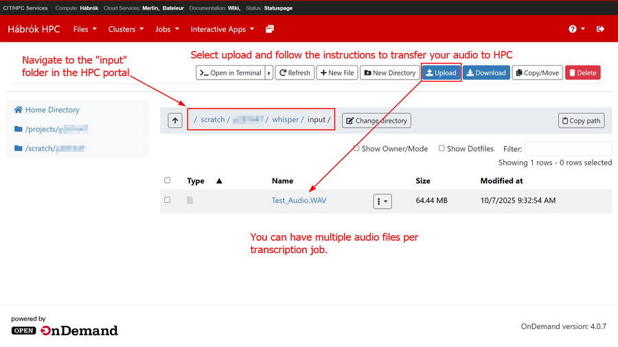 Now that you have the folder structure ready, you can upload the audio file(s) you wish to transcribe. Click on the “input” folder to open its window view, then click Upload and follow the instructions to transfer your audio to the HPC environment. Please note that the example here contains a single file, but that Whisper can transcribe multiple files in the same job. Feel free to upload as many audio files as needed. The only limitation you have is that the maximum runtime of Whisper, as it is set up now, covers about 20 hours of interviews. If you need to transcribe more than this amount of time, please consider splitting the data into two separate batches and launching two separate jobs.