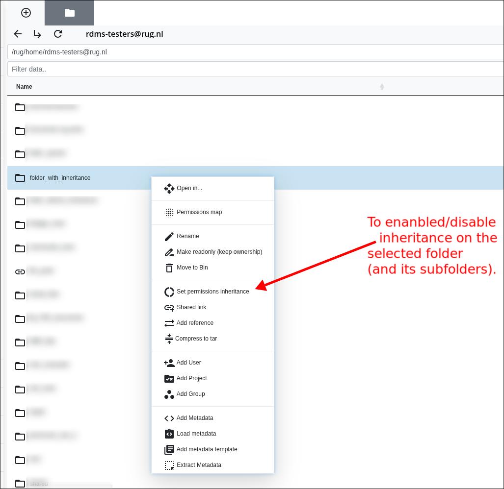 # We check now the permissions again. Even with enabled inheritance, the permissions of the original folder are kept. Reason: Moving data does not count as new data --> Inheritance is not applied. Note that only rdms-testers@rug.nl has own permission. These are the original permissions before the move!
