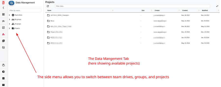 Clicking on the “Data Management” tab in the menu will open a browser window, as shown below. This window will allow you to select groups, team drives, or projects for which you have management permissions. If you want to display the data contained in Team Drives or Projects, you can do it from this page as well, but we suggest you use the Data Browser instead.